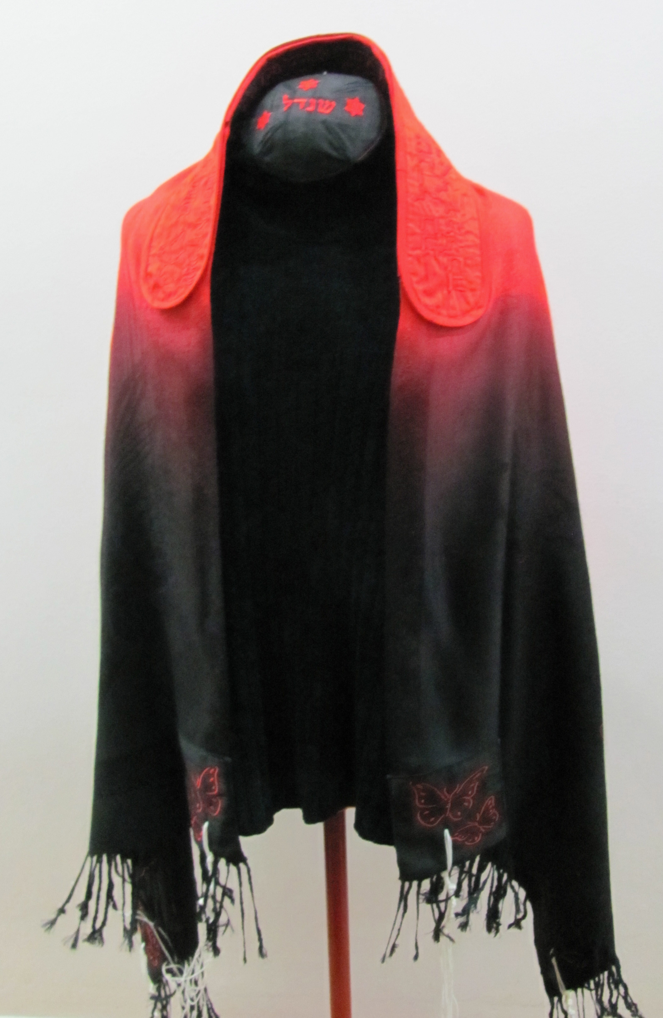 LEFT; Ombered red to black cashmere and silk tallit with silk atarah and corners created for an octogenarian Bat Mitzvah in South Florida. Silk kippah to coordinate with the Tallit. Custom made for a special Bat Mitzvah .