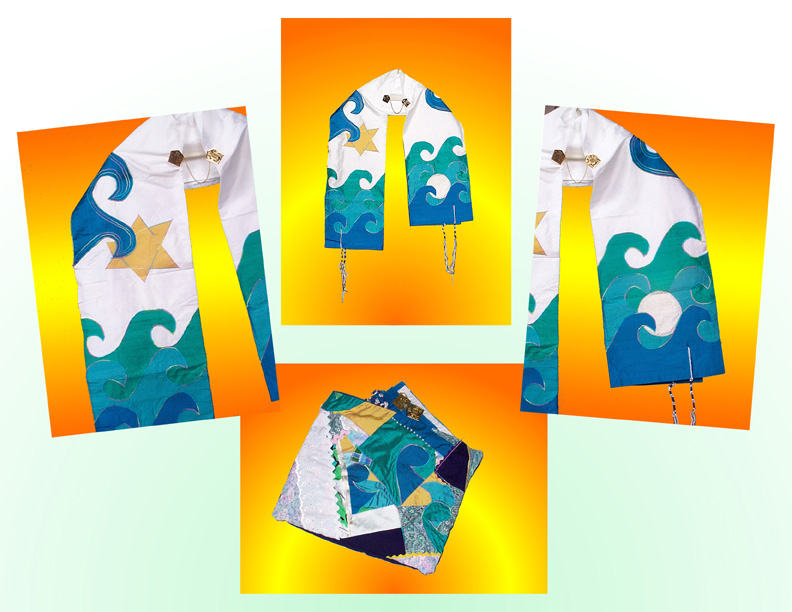 Margaret wanted a very special Tallit for herBat Mitzvahin Melbourne, Florida. HerHebrew Namescan be translated as "star" and "pearl". Margaret adores the water. In lieu of stripes it was decided to have machine appliqueed waves. On one side of the rectangular (approximately 22" x 66")Tallit,is a whitedupioni silkpearl. The wholeTallit isDupioni silk.Above the water on the other side, is aMagen David. TheAtarahis non-conventional and wave-shaped). The Tallit Bag is fun and funky in aCrazy Quilt technique. There is also a coordinating Kippahwhich is not shown here.