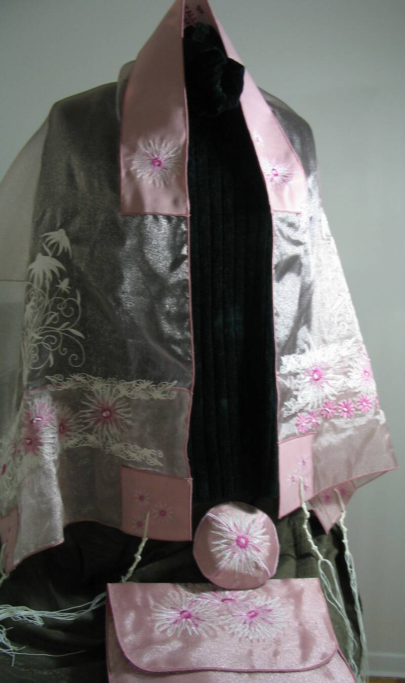 BELOW: Beautifully custom crafted dupioni silk TALLIT with scattered assumetrical daisies embroidered. Owner's name is embroidered in Hebrew handwriting font. Note that the dupioni silk is a two colour weave with green threads and pink threads. This tallit set was created for a Bat Mitzvah girl in Hamilton, Ontario Canada. 2008. For your custom version of this beautiful tallit click here.